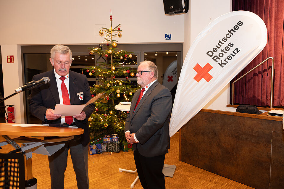 Präsident Norbert Södler überreichte die Verdienstmedaille. Seit 55 Jahren engagiert sich Helmut Petri im Deutschen Roten Kreuz. 1970 ist er mit 16 Jahren ins DRK OV Elz eingetreten. Bereits kurze Zeit später übernahm er Verantwortung und leitete das Jugendrotkreuz in Elz. 1973 wurde er stellvertretende JRK-Leiter im Kreisverband und übernahm die Leitung des JRK im Kreisverband von 1975 bis 1980. Seit 1993 ist er stellvertretende Vorsitzende im Kreisverband. Er arbeitet seit vielen Jahren in der Blutspende mit, war Ausbilder in der aktiven Arbeit und stellvertretende Vorsitzender in Elz. Bereits 2017 erhielt er den Landesehrenbrief. Seit fünf Jahren engagiert er sich für sein Herzensprojekt „Wünsche werden wahr“. Dies sei für den Kreisverband ein Leuchtturmprojekt, so Norbert Södler. „Helmut Petri ist immer da“, so Södler, „und es ist großartig, wie er sich den Menschen annimmt.“